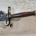 Wooden hand grip with decorative aged brass pommel.