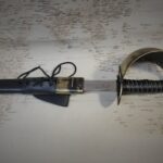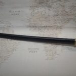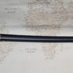It is approximately 33″ from the tip of the blade to the end of the handle and weighs approximately 3.4 lbs.. The false edged metal alloy blade is 27″ long and is not sharpened nor is it recommended to be sharpened.