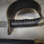 The scabbard is made from a faux black leather with brass hardware and incudes a black leather sword frog to help attach it to a belt.