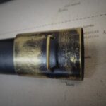 The handle is made from a brass finished metal and has an imitation leather and brass wire wrap.