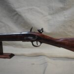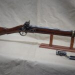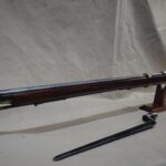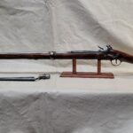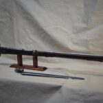 It weighs approximately 6 lbs. and is 58″ long with an aged brass and pewter metal finish. The Bayonet is 20″ long. Rifle is 74″ long overall with bayonet attached.