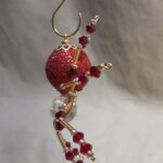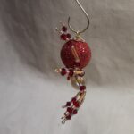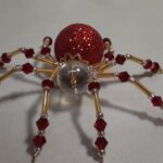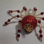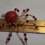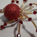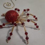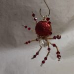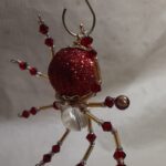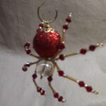 This is a handmade beaded Christmas Ornament spider. The abdominal area is made from a glitter encrusted red plastic bead and the head from a smaller crystal clear plastic bead. The legs are made from 21 ga. brass wire which are covered with small red Swarovski glass beads and gold glass beads. A gold decorative hook is attached to the back of the abdomen and can be used to hang the spider or be removed.