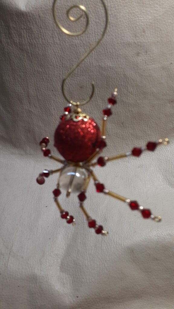 This is a handmade beaded Christmas Ornament spider. The abdominal area is made from a glitter encrusted red plastic bead and the head from a smaller crystal clear plastic bead. The legs are made from 21 ga. brass wire which are covered with small red Swarovski glass beads and gold glass beads. A gold decorative hook is attached to the back of the abdomen and can be used to hang the spider or be removed.