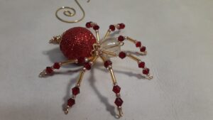 This is a handmade beaded crystalline spider. The abdominal area is made from a penguin-bodied plastic bead and the head from a smaller white bead. The legs are made from 21 ga. brass wire which are covered with small Swarovski Glass black beads and silver glass beads. Silver bead caps are also incorporated into the body. A gold decorative hook is attached to the back of the abdomen and can be used to hang the spider or be removed.