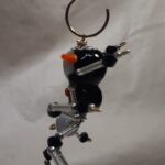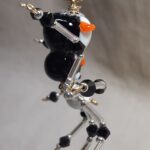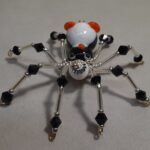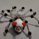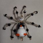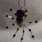 This is a handmade beaded crystalline spider. The abdominal area is made from a penguin-bodied plastic bead and the head from a smaller white bead. The legs are made from 21 ga. brass wire which are covered with small Swarovski Glass black beads and silver glass beads. Silver bead caps are also incorporated into the body. A gold decorative hook is attached to the back of the abdomen and can be used to hang the spider or be removed.