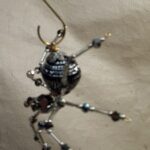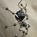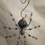 This is a handmade beaded metallic spider. The abdomen is made from a silver and black textured plastic bead and the head is a clear faceted bead. The legs are made from flexible but sturdy 21 ga. wire which are covered with large crystalline silver Swarovski Glass beads with small black and silver glass beads. Silver bead caps are also incorporated into the body. A decorative gold hook is attached to the back of the abdomen and can be used to hang the spider or be removed.