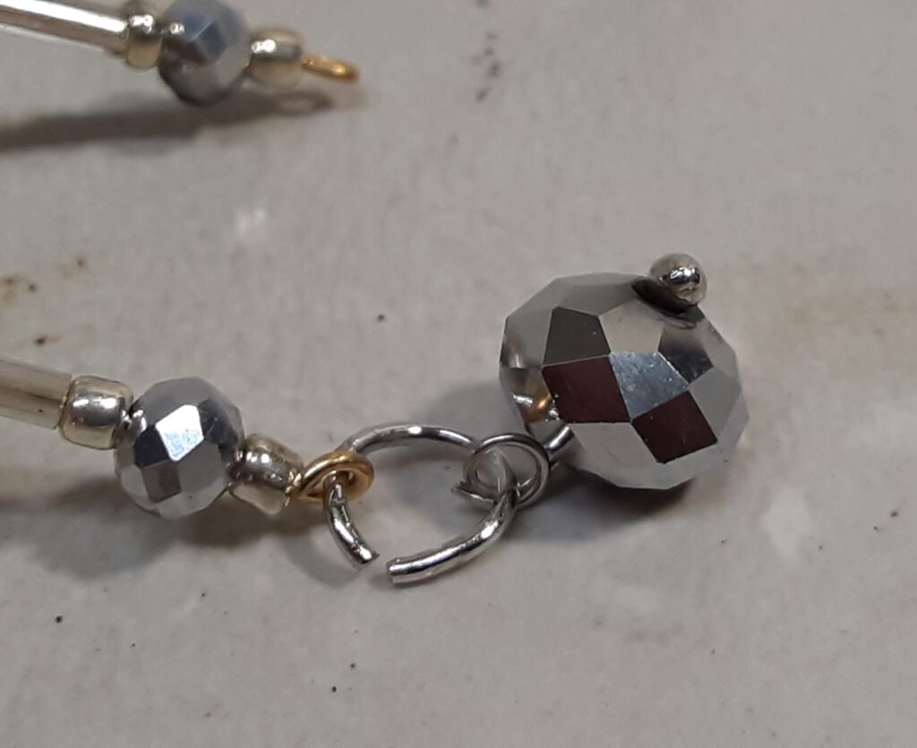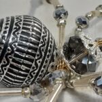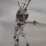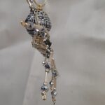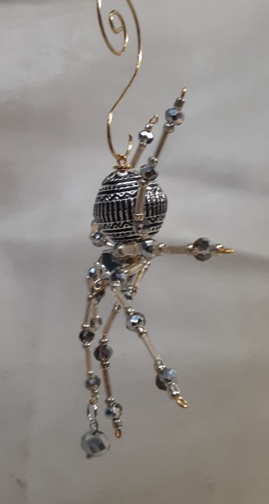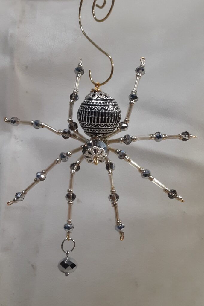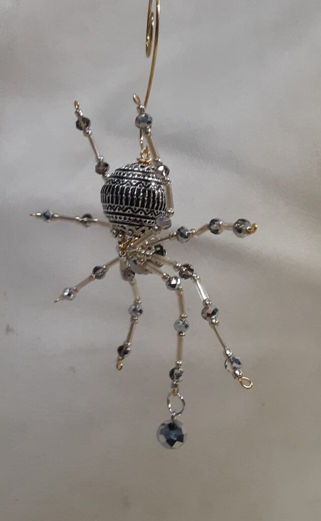 This is a handmade beaded striped spider. The abdomen is made from a silver and black textured plastic bead and the head is a pewter faceted plastic bead. The legs are made from flexible but sturdy 21 ga. brass wire which are covered with small silver Swarovski Glass beads with small black and silver glass seed beads. Silver bead caps are also incorporated into the body. A decorative gold hook is attached to the back of the abdomen and can be used to hang the spider or be removed.