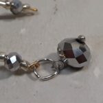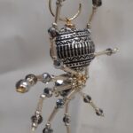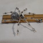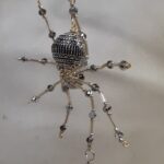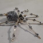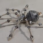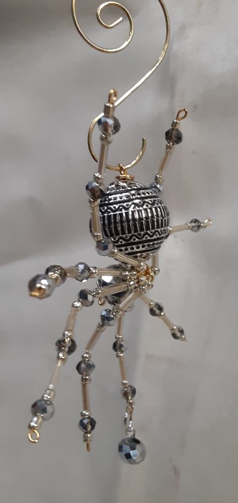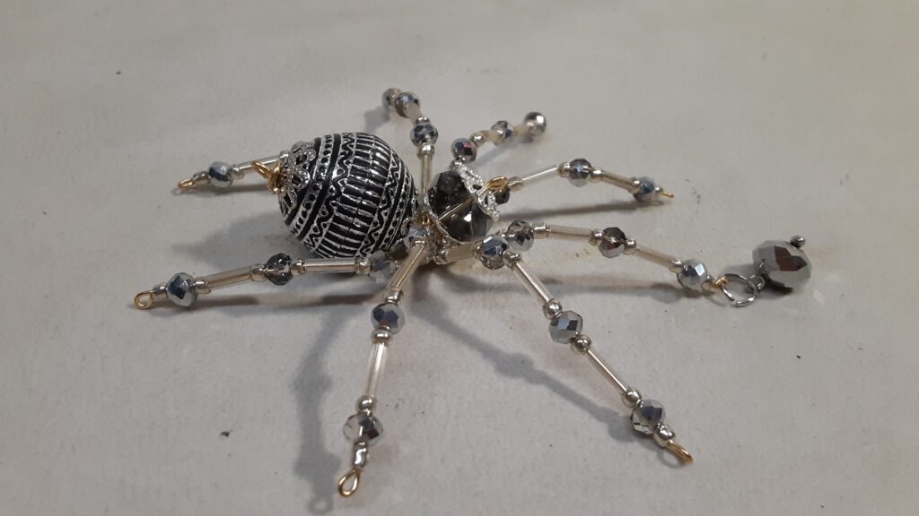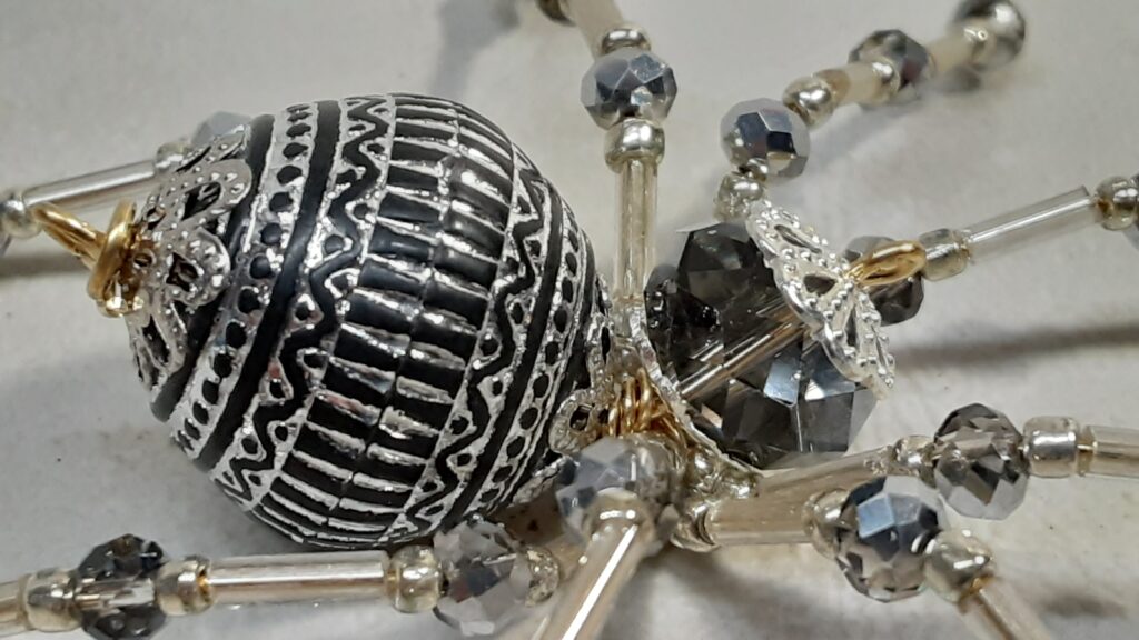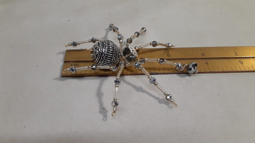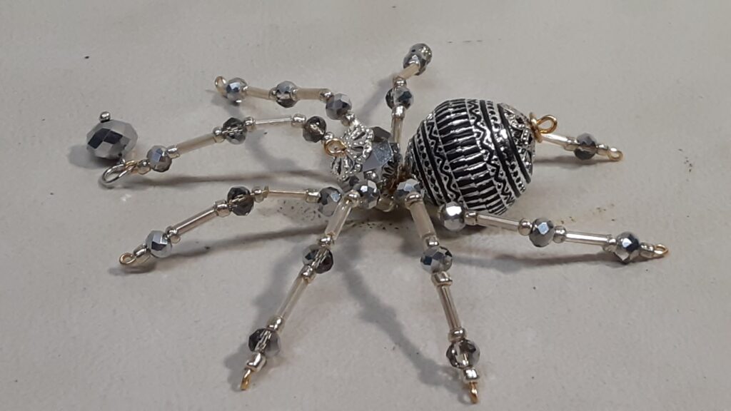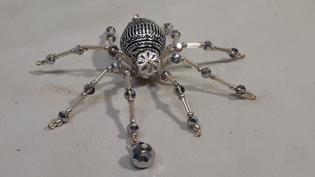 A small pewter faceted bead has been attached to one of the front legs to simulate a dew drop dripping from the spider’s leg.
