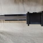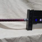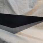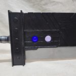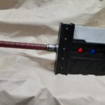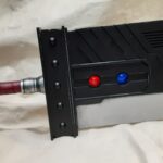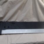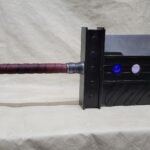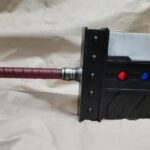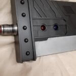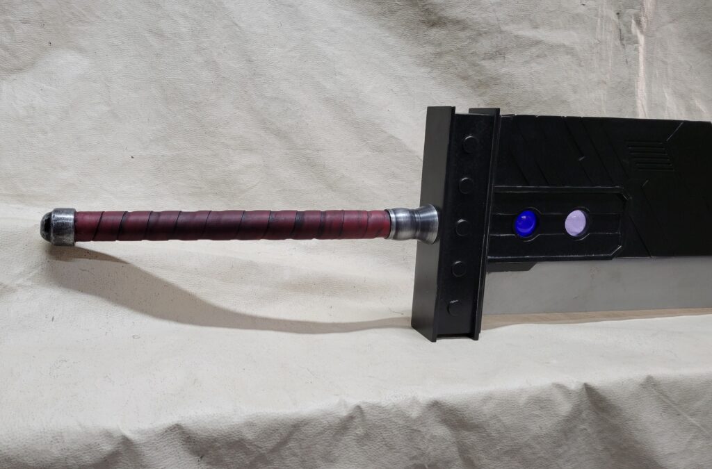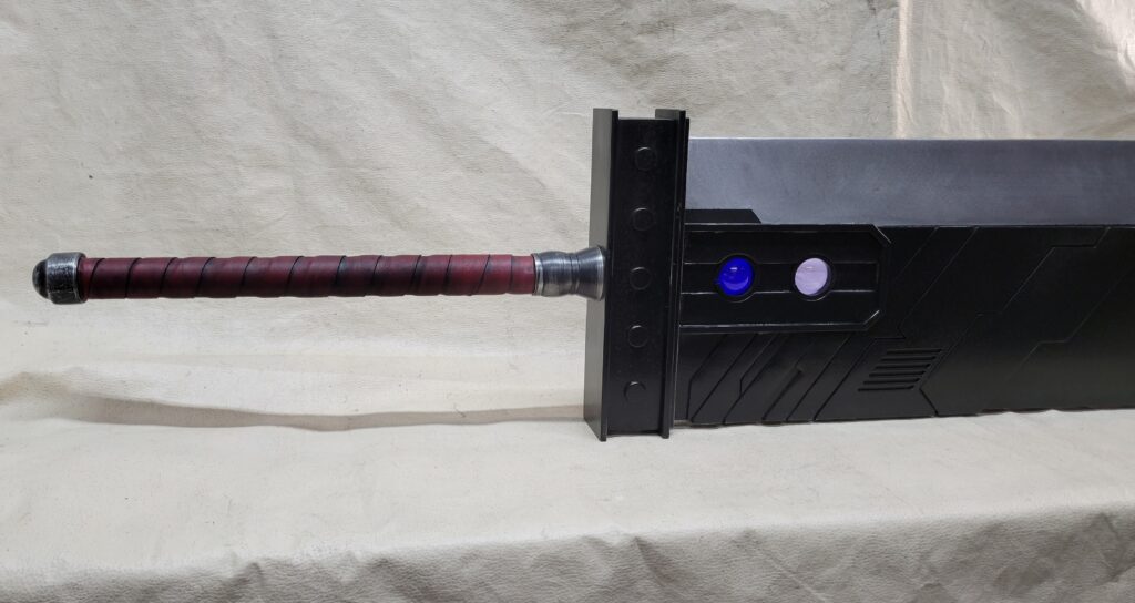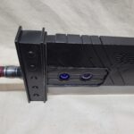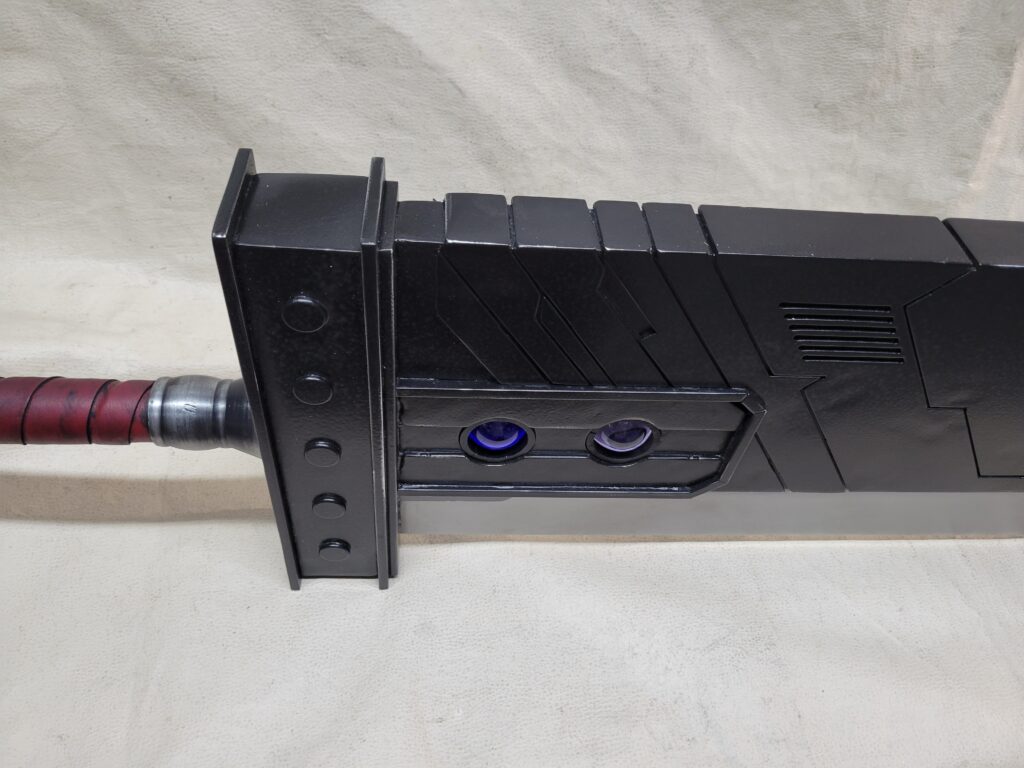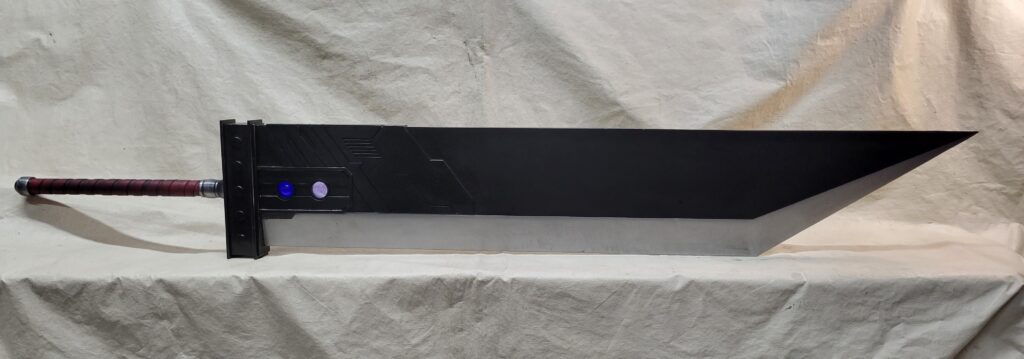This is a custom reproduction of Cloud Strife’s Buster Sword from the FFVII game series upcoming remake, or actually the first version of the remake. Constructed primarily from Aluminum the sword is cut from 1/8″ sheet, welded together with internal bracing, filled with foam to help prevent internal rattling, then ground and sanded to a smooth finish, with a second layer of aluminum added for the raised areas and textured black painting added to finish the product.
