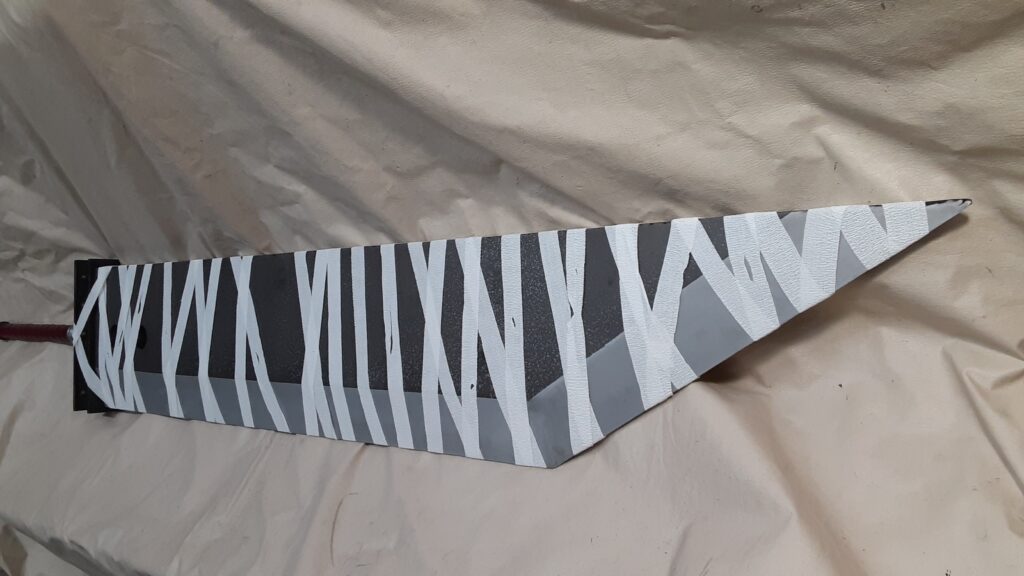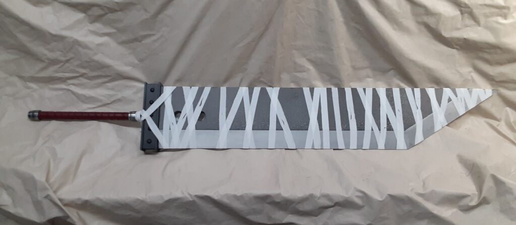 This is a custom reproduction of Cloud Strife’s Buster Sword from the Kingdom Hearts game series. Constructed primarily from Aluminum the sword is cut from 1/8″ sheet, welded together with internal bracing, filled with foam to help prevent internal rattling, then ground and sanded to a smooth finish with textured painting added to finish the product.