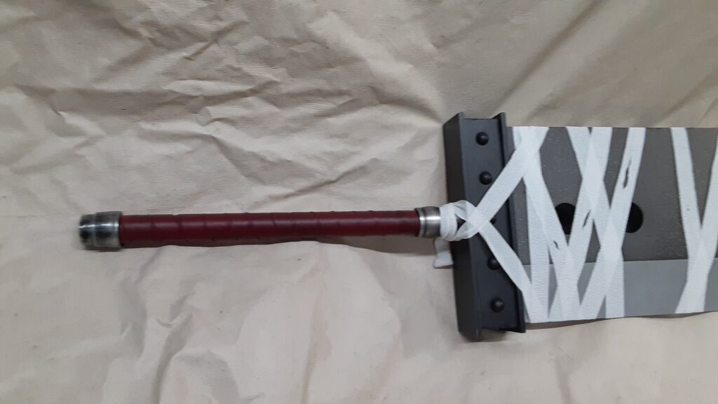 It is approximately 6′-3″ from the tip of the blade to the end of the handle and weighs approximately 21 lbs. The blade is 10″ wide and 1.5″ thick with a battle worn roughness to it and a darker finish than the original sword. Bandage wrappings are on the blade as well to match the version from the KH series.