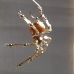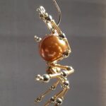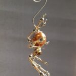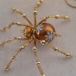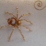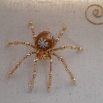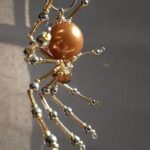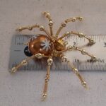 This is a handmade beaded snowflake spider. The abdominal area is made from a larger plastic copper colored bead with a small faceted copper hued bead for the head. The legs are made from flexible but sturdy 21 ga. wire which are covered with small gold Swarovski Glass and can be carefully adjusted to almost any position. A gold decorative hook is attached to the back of the abdomen and can be used to hang the spider or be removed.