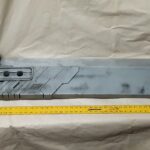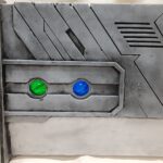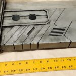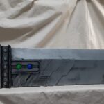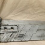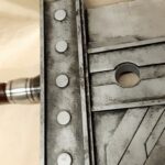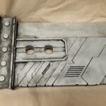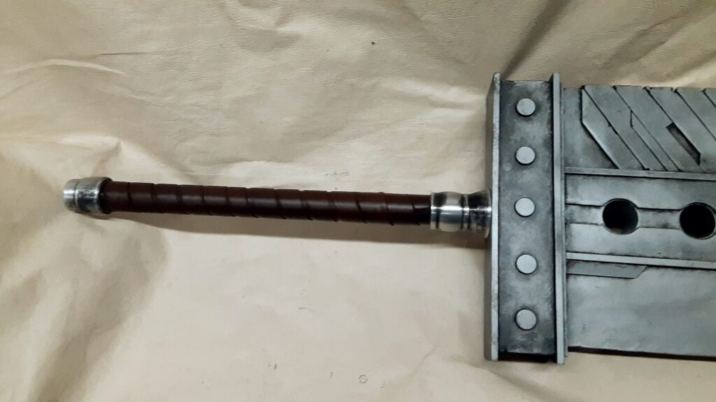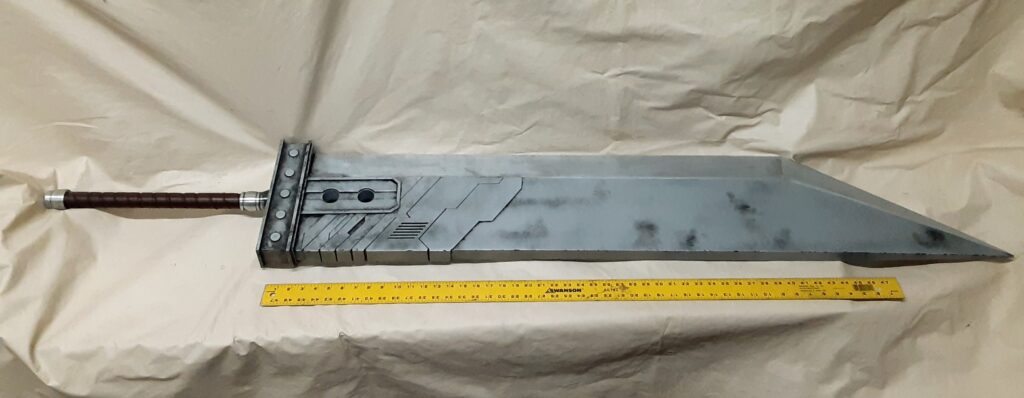 Constructed primarily from Aluminum the sword is cut from 1/8″ sheet, welded together with internal bracing, filled with foam to help prevent internal rattling, then ground and sanded to a smooth finish, with a second layer of aluminum added for the raised areas and textured black, silver and gray painting added to finish the product.
