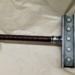 It is approximately 6′-3″(190.5 cm) from the tip of the blade to the end of the handle and weighs approximately 25 lbs. (11.3 kilograms). The blade is 10.25″ (26 cm)wide and 1.25″ (3.2 cm)thick with a battle worn roughness to it.