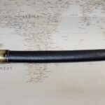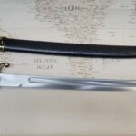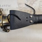 The scabbard is made from a black imitation leather with brass hardware and incudes a black leather sword frog to help attach it to a belt.