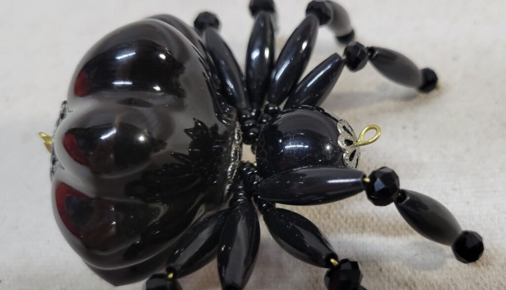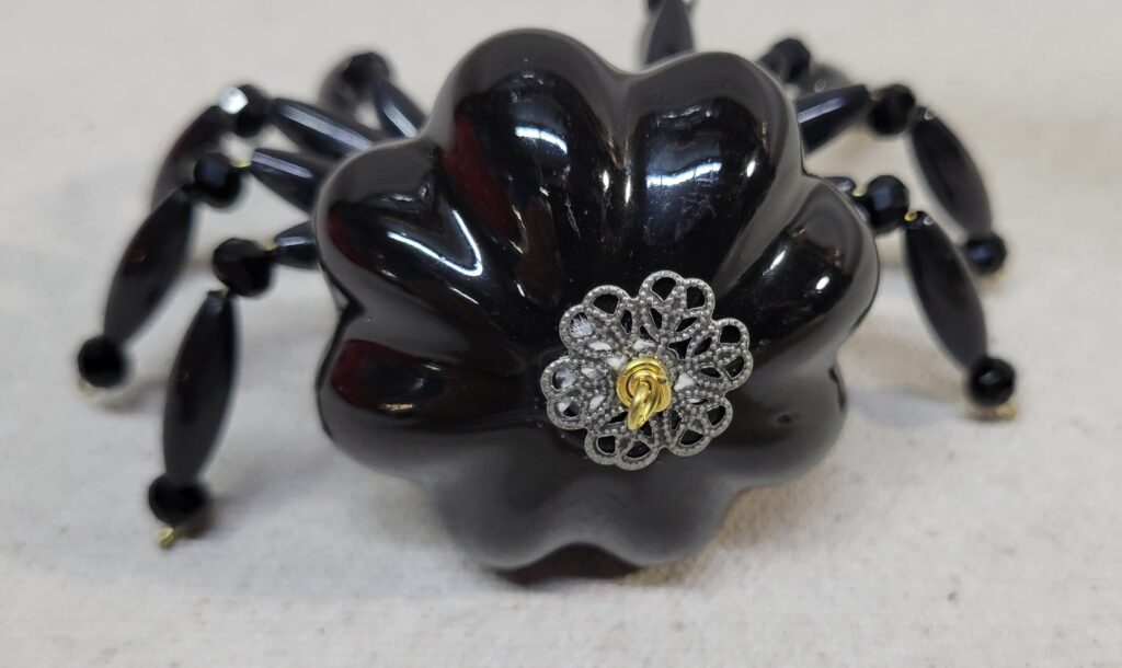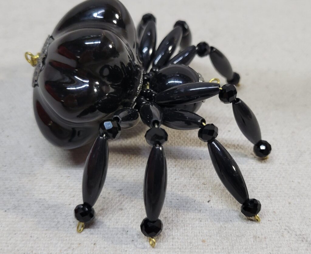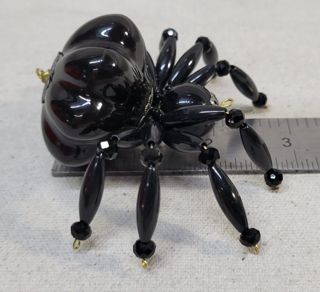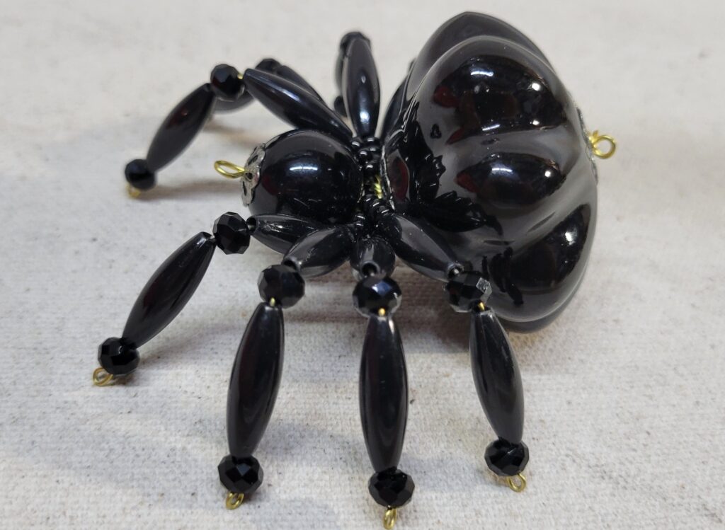 The legs are made from flexible but sturdy 20 ga. brass wire which are covered with long black plastic beads and black faceted beads.