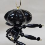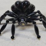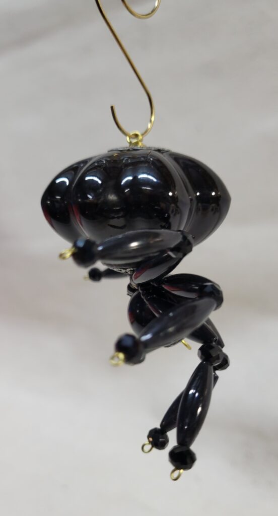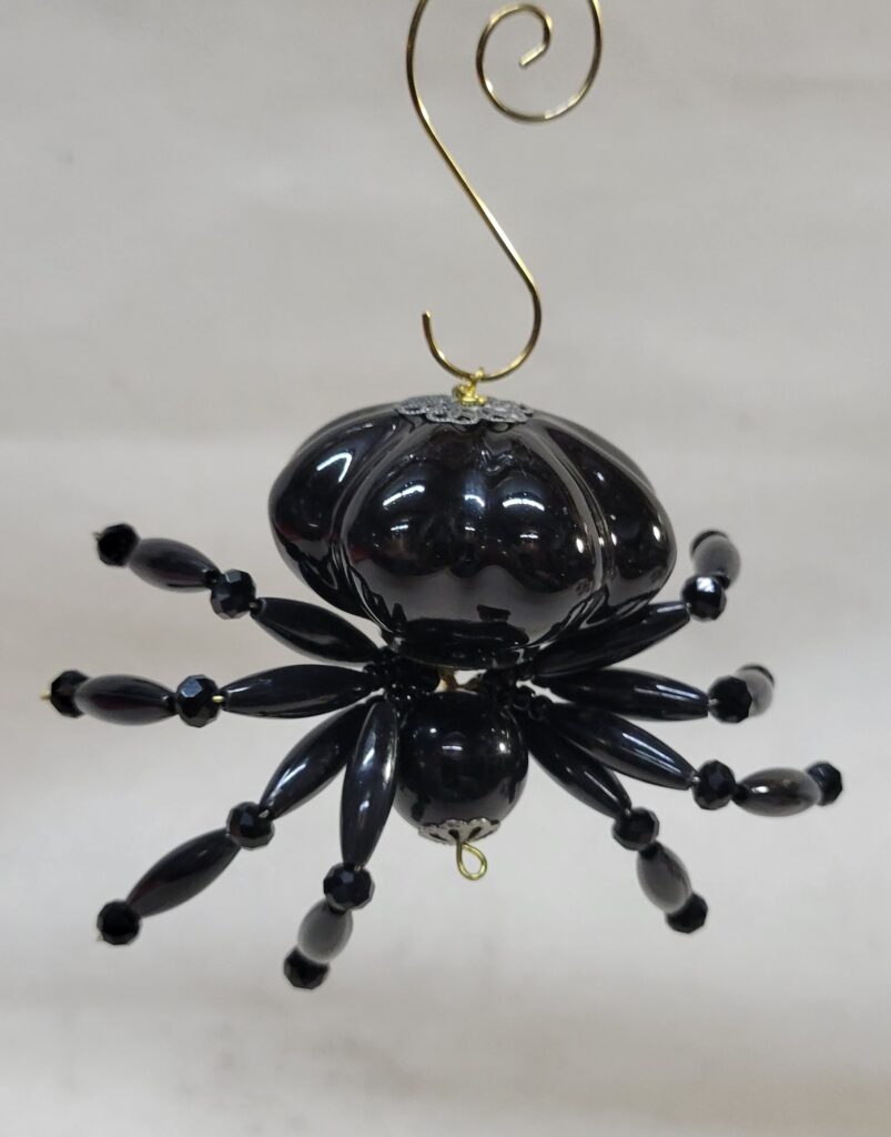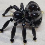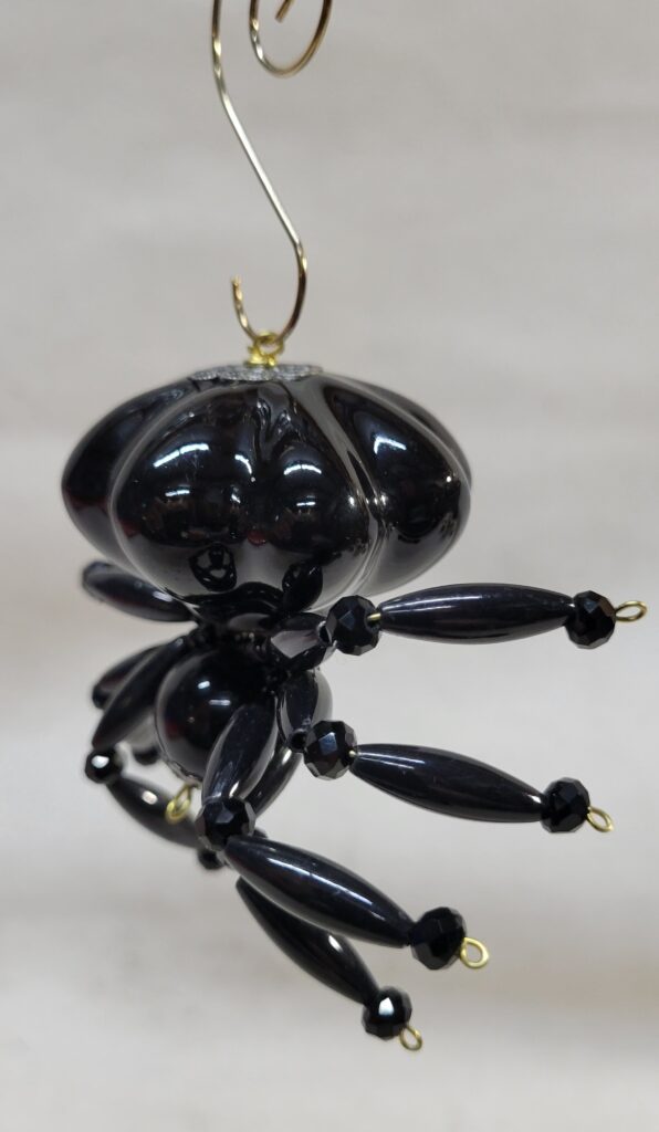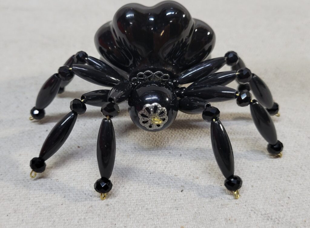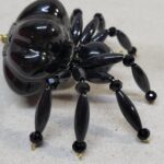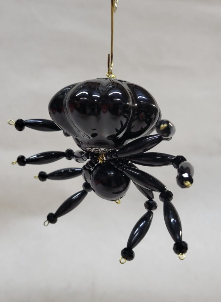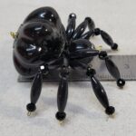 The legs are made from flexible but sturdy 20 ga. brass wire which are covered with long black plastic beads and black faceted beads.