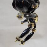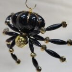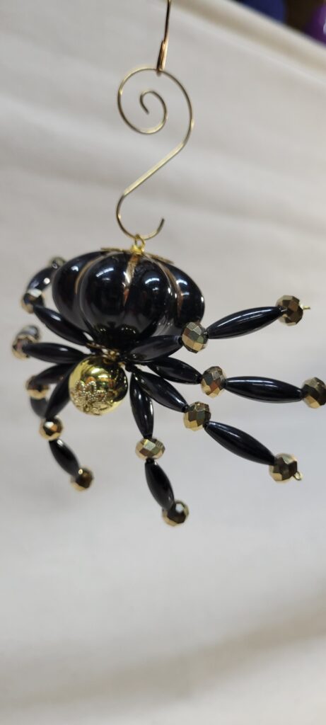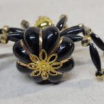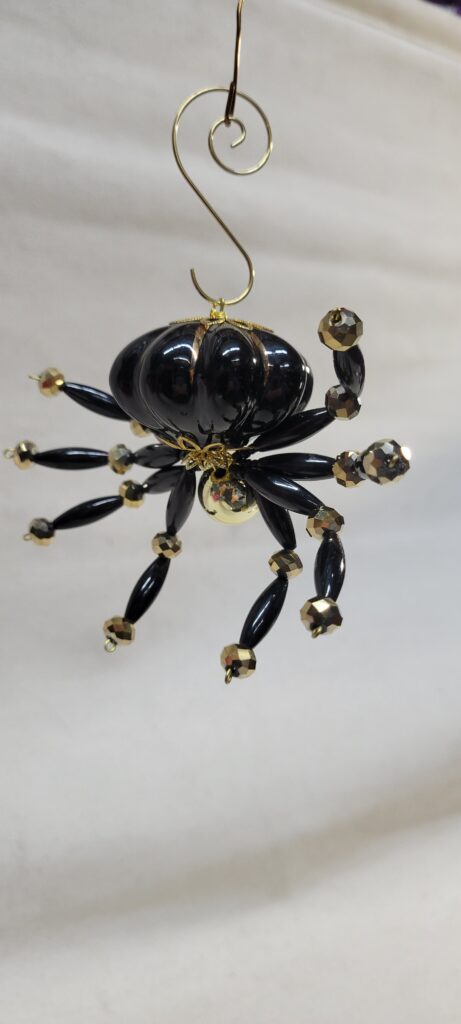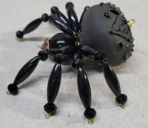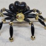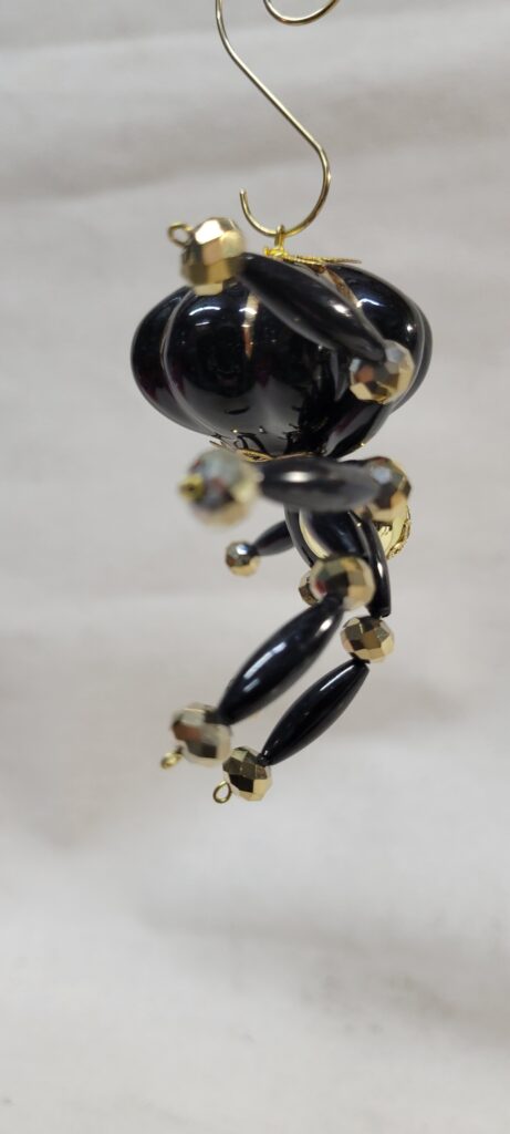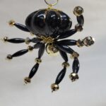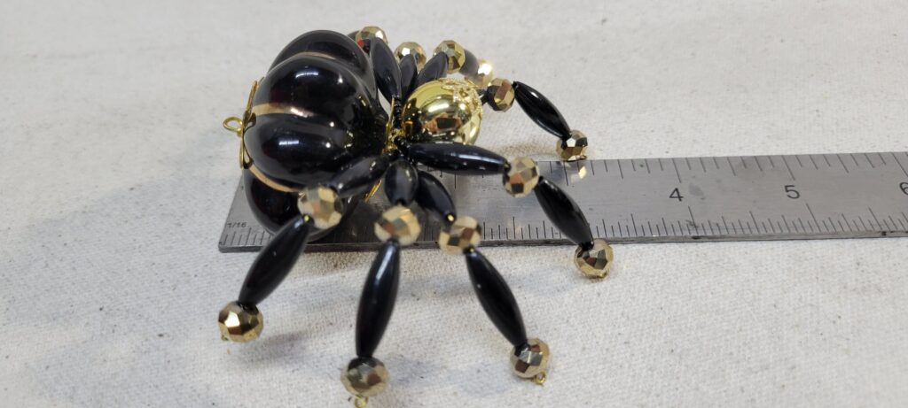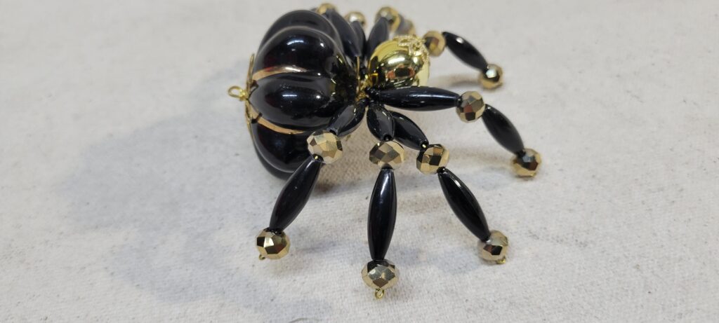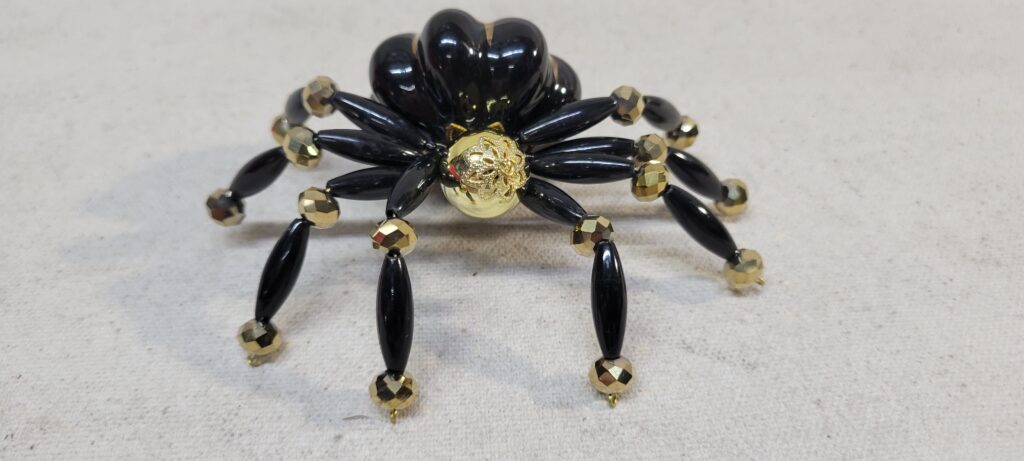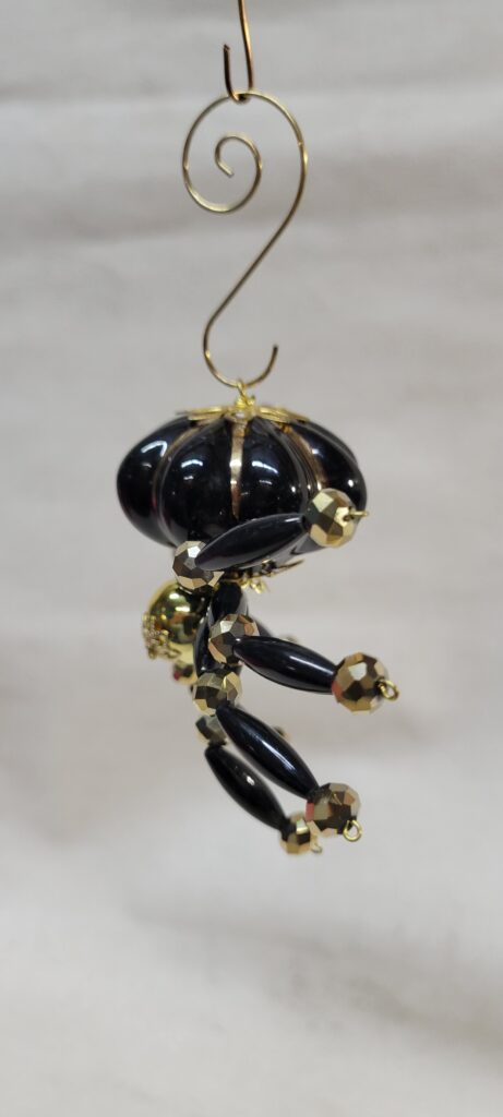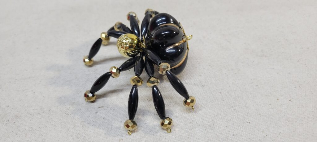 The legs are made from flexible but sturdy 20 ga. wire which are covered with long black beads and gold crystal beads.