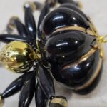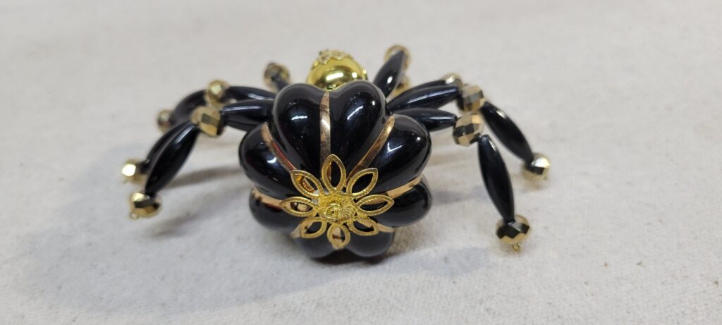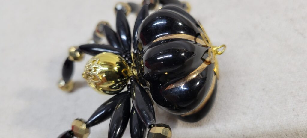 This is a very large handmade beaded one of a black and gold ceramic spider.
