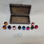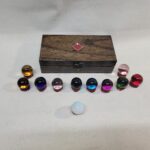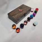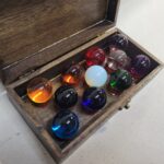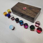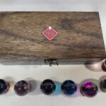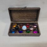 These orbs are 30 mm and include a 2″ tall x 4″ wide x 8″ long aged wooden display box finished in a walnut stain with the Shinra Corporation’s logo on top.