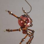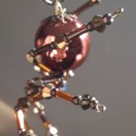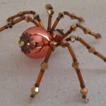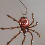 This is a handmade beaded crystalline spider. The abdominal area is made from a 20 mm metallic copper bead and the head from a smaller amber faceted glass bead. The legs are made form 21 ga. wire which are covered with small Swarovski Glass and glass beads that can be carefully adjusted to almost any position. Copper bead caps are also incorporated into the body. A gold decorative hook is attached to the back of the abdomen and can be used to hang the spider or be removed.
