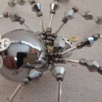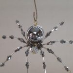 This is a handmade beaded crystalline spider. The abdominal area is made from a 20 mm metallic pewter bead and the head from a smaller pewter faceted metallic bead. The legs are made form 21 ga. wire which are covered with small Swarovski Glass and glass beads that can be carefully adjusted to almost any position. Silver bead caps are also incorporated into the body. A gold decorative hook is attached to the back of the abdomen and can be used to hang the spider or be removed.