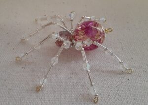 This is a handmade beaded crystalline spider. The abdominal area is made from a 20 mm pink metallic bead and the head from a smaller pink glass bead. The legs are made form 21 ga. wire which are covered with small clear Swarovski Glass and silver glass beads that can be carefully adjusted to almost any position. Gold bead caps are also incorporated into the body. A gold decorative hook is attached to the back of the abdomen and can be used to hang the spider or be removed.