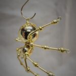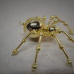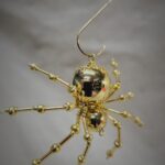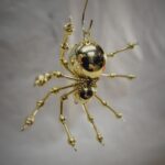 This is a handmade beaded crystalline spider. The abdominal area is made from a metallic gold bead and the head from a smaller gold bead. The legs are made form 21 ga. wire which are covered with small glass and plastic beads that can be carefully adjusted to almost any position. A gold decorative hook is attached to the back of the abdomen and can be used to hang the spider or be removed.