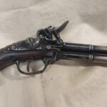 This is an aged version of an 18th century 2 barrel flintlock pistol.