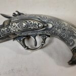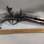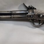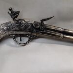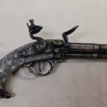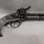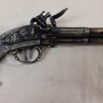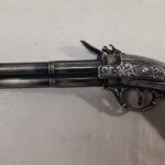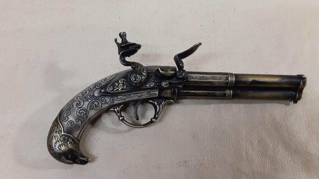 This is an aged version of an 18th century 3 barrel flintlock pistol.