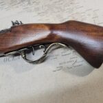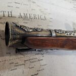 Butt of the gun has pewter filigree on the side.