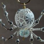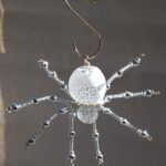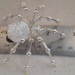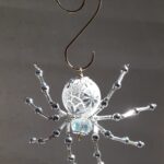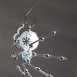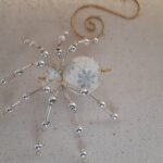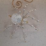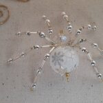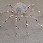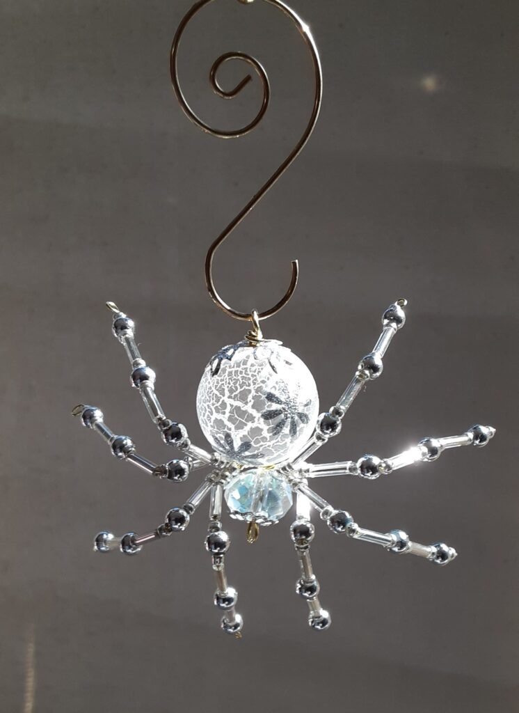 This is a handmade beaded crystalline snowflake spider. The abdominal area is made from a larger plastic frosted bead with a small faceted clear bead for the head. The legs are made from flexible but sturdy 21 ga. wire which are covered with small silver Swarovski Glass and can be carefully adjusted to almost any position. A gold decorative hook is attached to the back of the abdomen and can be used to hang the spider or be removed.