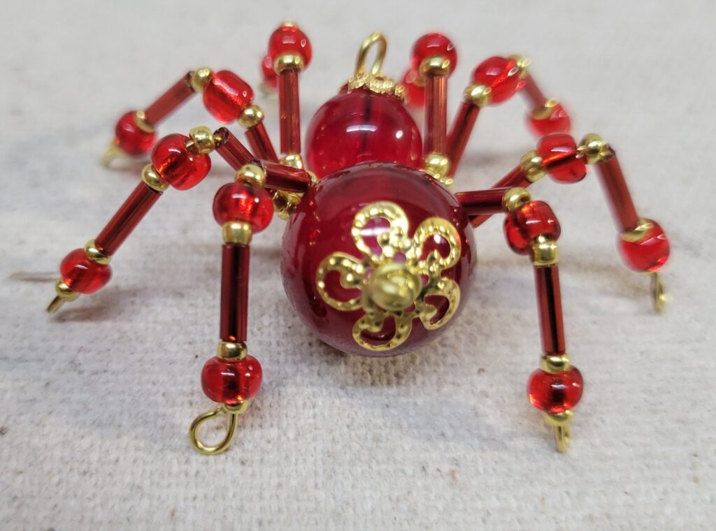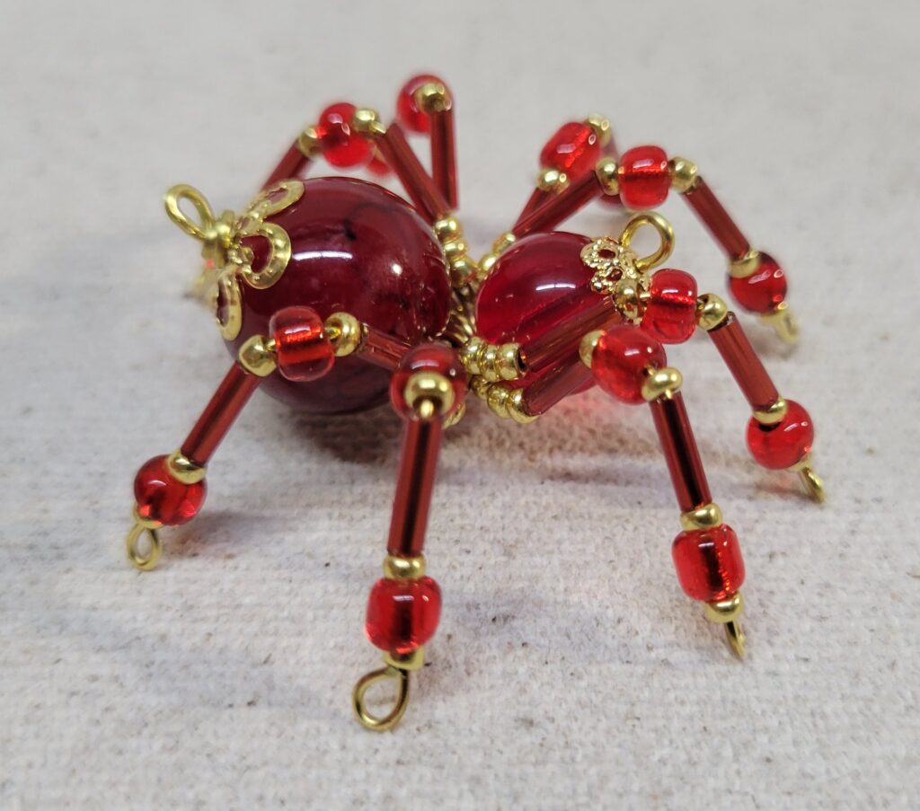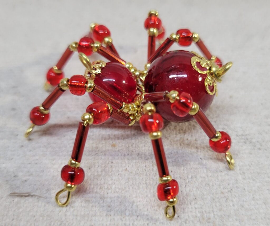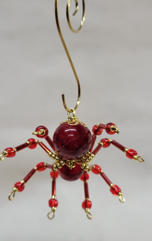 This is a handmade beaded spider. The abdominal area is made from a dark red bead and the head from a smaller red faceted bead. The legs are made from 21 ga. wire which are covered with small gold and red glass beads. A gold decorative hook is attached to the back of the abdomen and can be used to hang the spider or be removed.