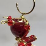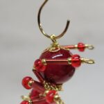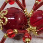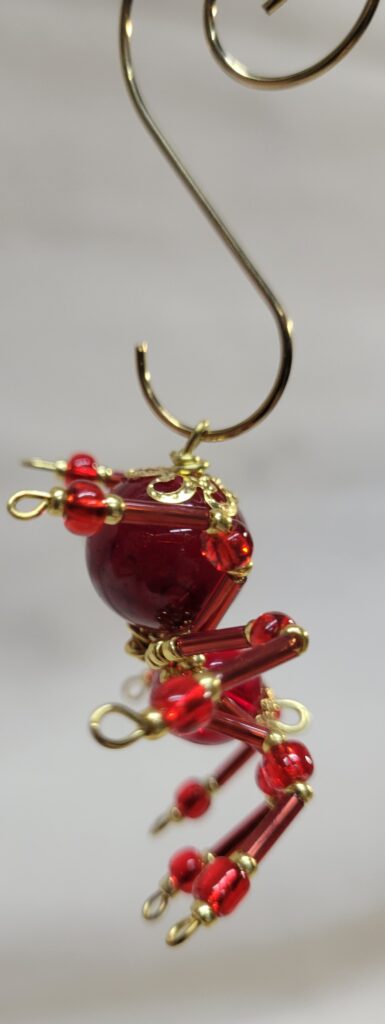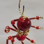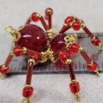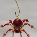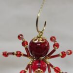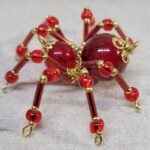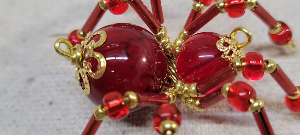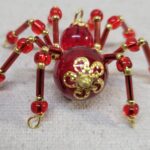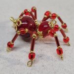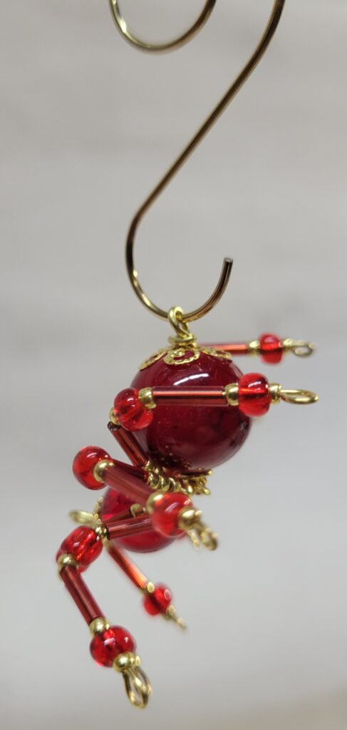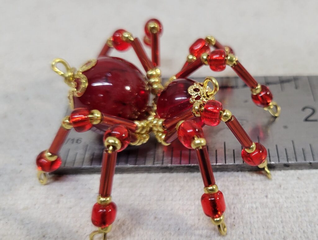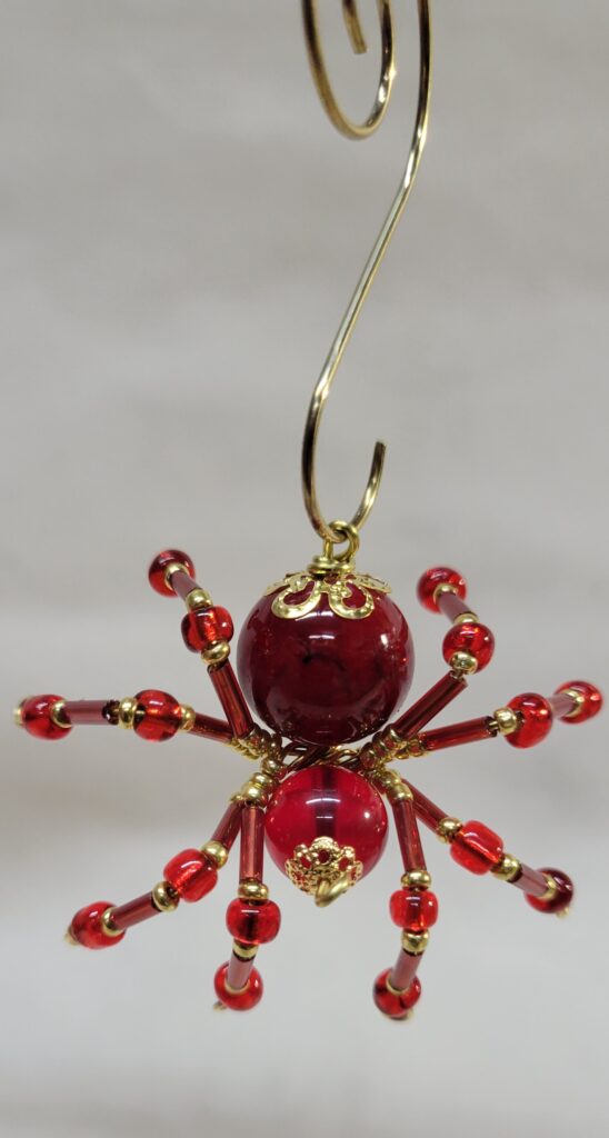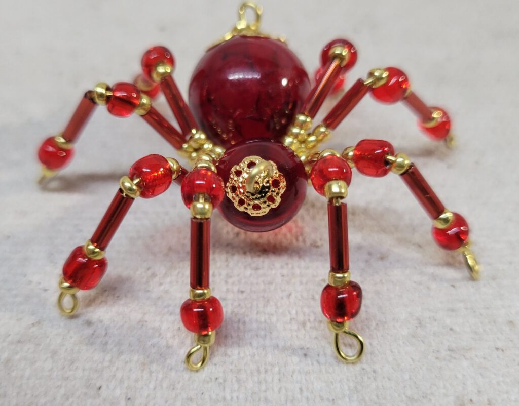 This is a handmade beaded spider. The abdominal area is made from a dark red bead and the head from a smaller red faceted bead. The legs are made from 21 ga. wire which are covered with small gold and red glass beads. A gold decorative hook is attached to the back of the abdomen and can be used to hang the spider or be removed.