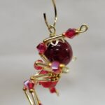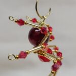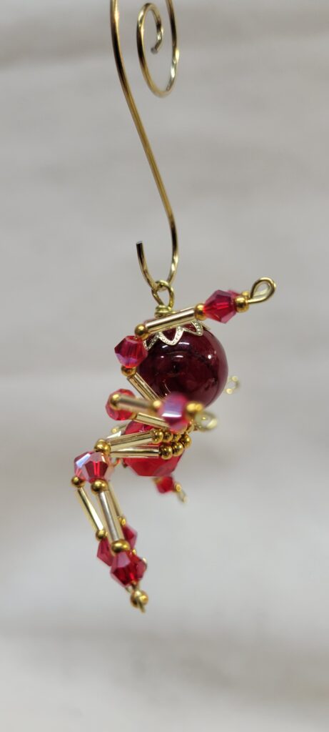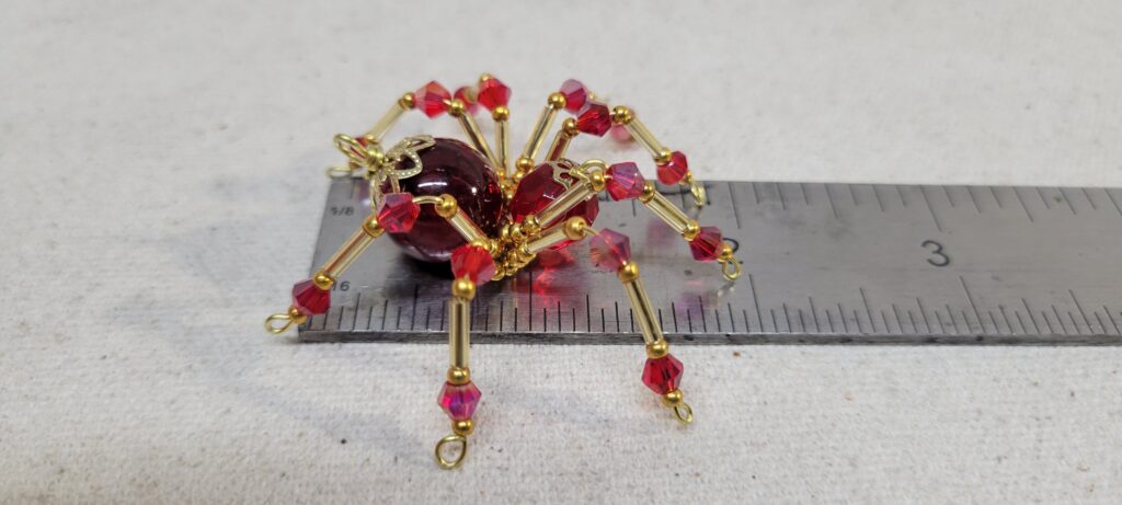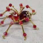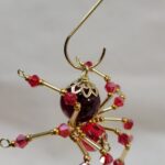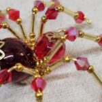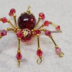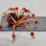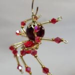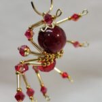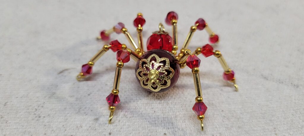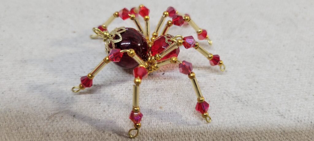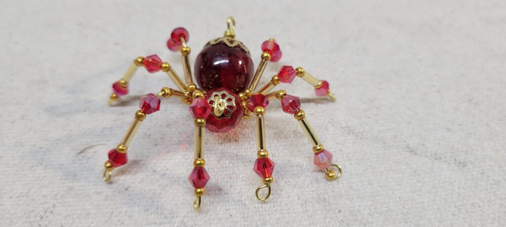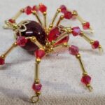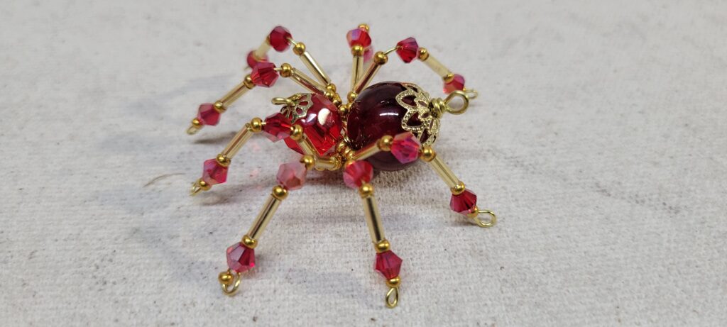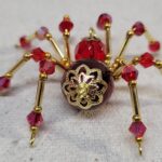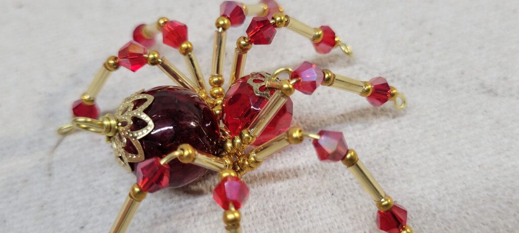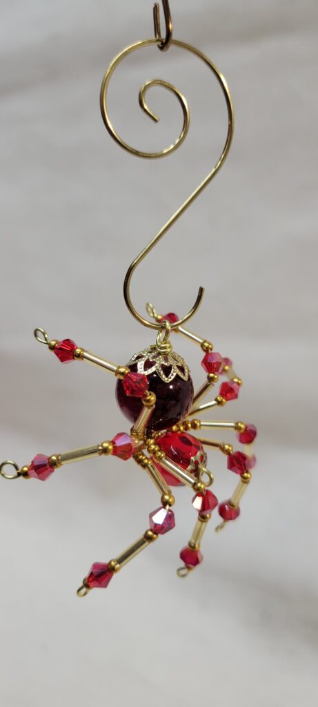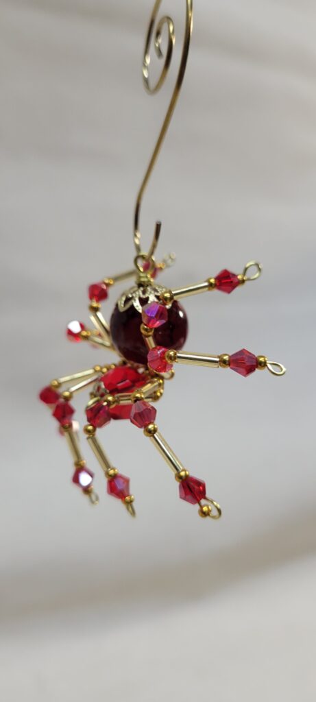 This is a handmade beaded crystalline spider. The abdominal area is made from a dark red plastic bead and the head from a smaller red faceted bead. The legs are made from 21 ga. wire which are covered with small Swarovski Glass and plastic beads. Gold bead caps are also incorporated into the body. A gold decorative hook is attached to the back of the abdomen and can be used to hang the spider or be removed.