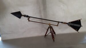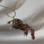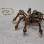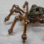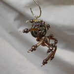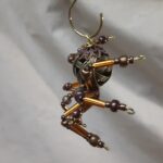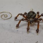 This is a handmade beaded metal spider. The abdominal area is made from a hollow brass metal bead. The head is a smaller copper colored metal bead with scrolling designs. The legs are made from flexible but sturdy 21 ga. brass wire which are covered with small glass beads and can be adjusted to almost any position. Copper bead caps are also incorporated into the body. A 2″ decorative hook is attached to the back of the abdomen and can be used to hang the spider or be removed.