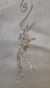 This is a handmade beaded metal spider. The abdominal area is made from a hollow brass metal bead. The head is a smaller copper colored metal bead with scrolling designs. The legs are made from flexible but sturdy 21 ga. brass wire which are covered with small glass beads and can be adjusted to almost any position. Copper bead caps are also incorporated into the body. A 2″ decorative hook is attached to the back of the abdomen and can be used to hang the spider or be removed.