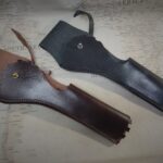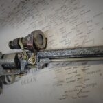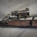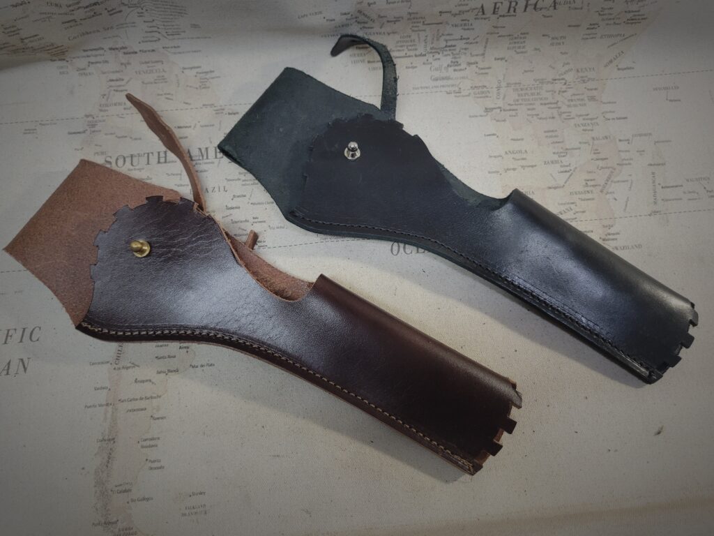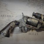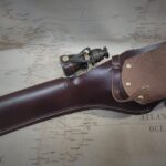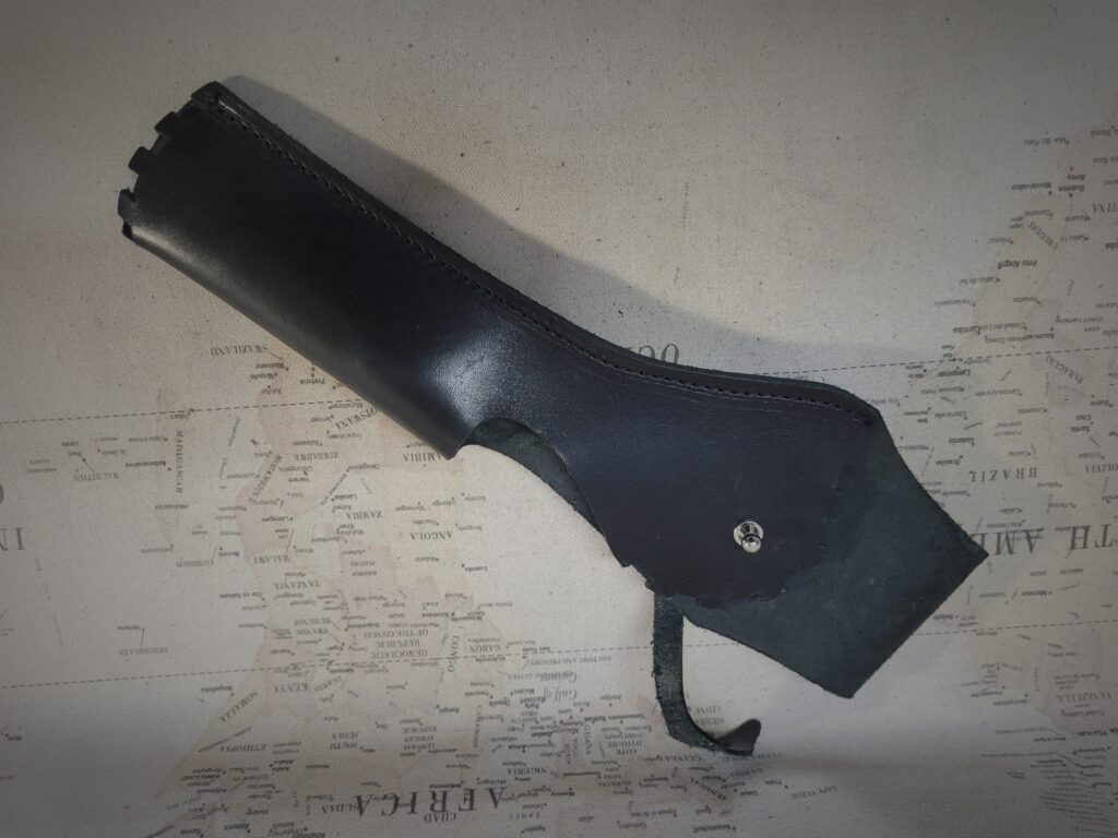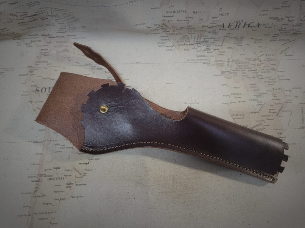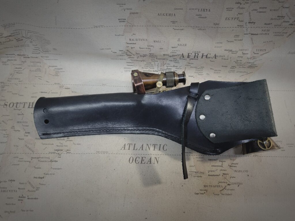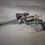An antique brass finished monocular has been fitted to the top of the pistol as a scope.