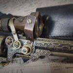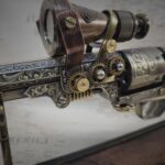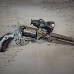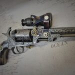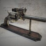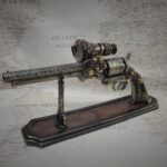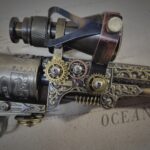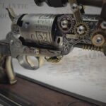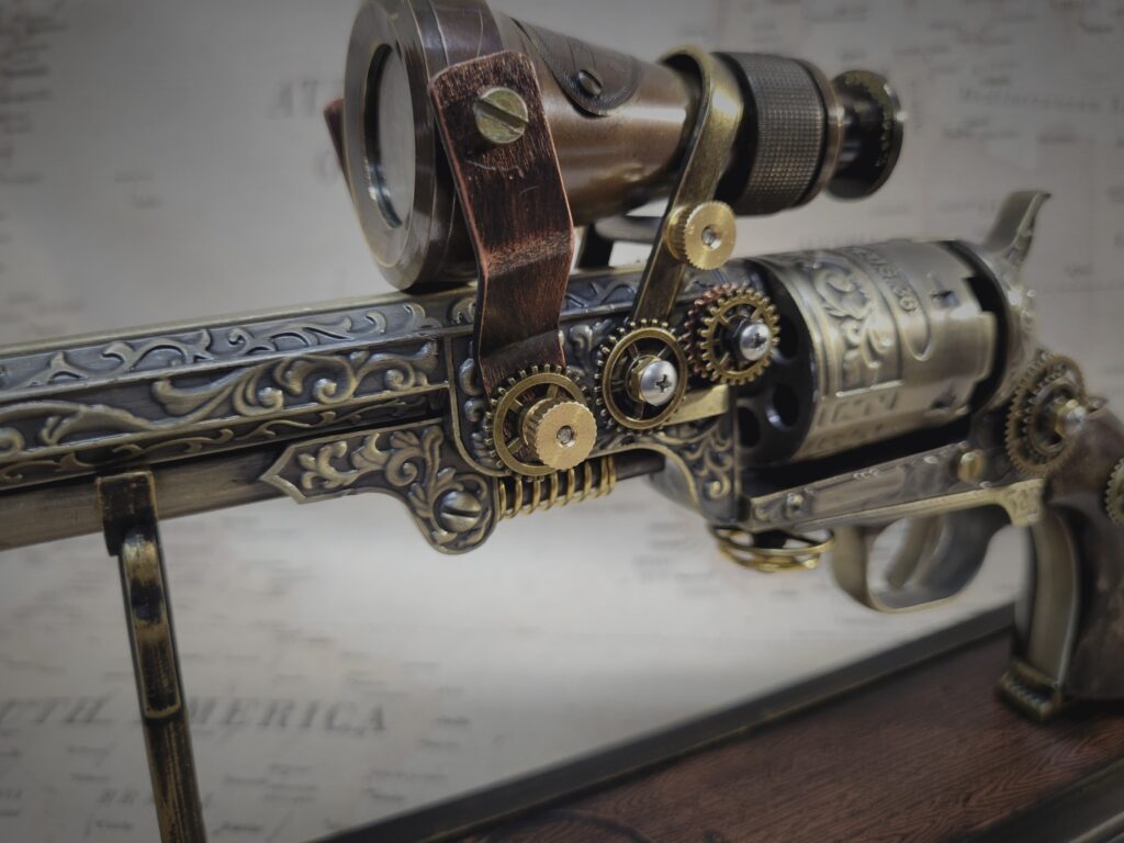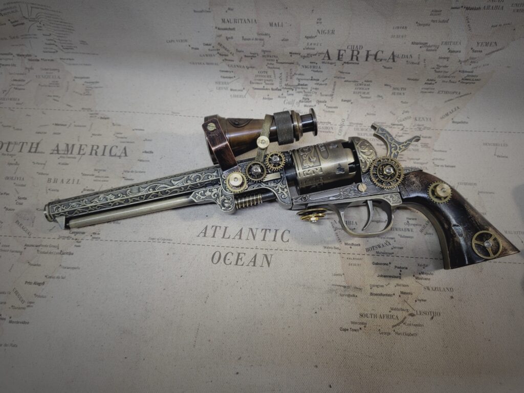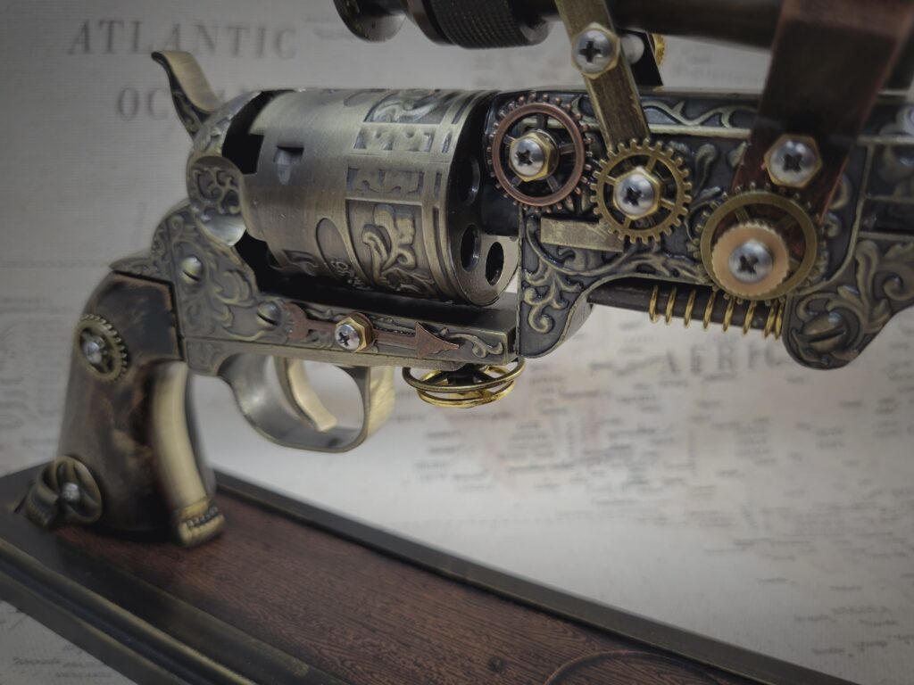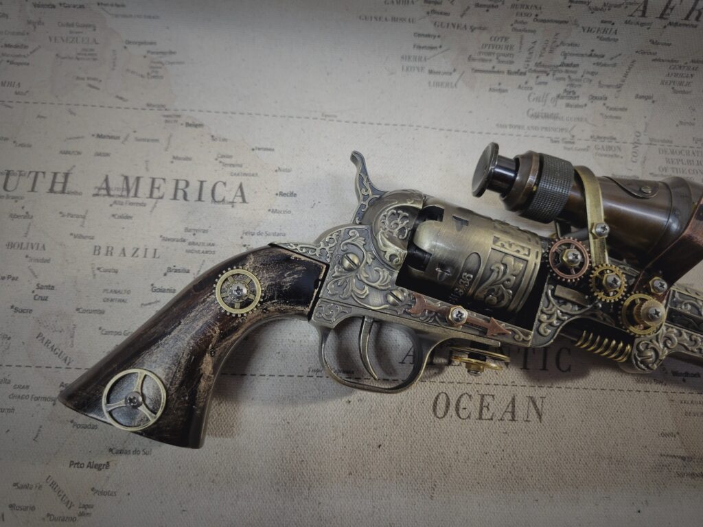 This is a steampunk version of an 1851 Navy Colt. It was used by both the Confederate and Union troops during the Civil War. I believe the original was a .36 caliber black powder.