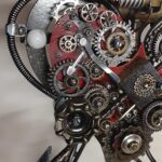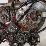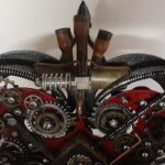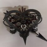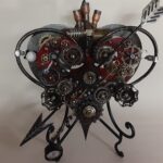 - The main heart is 1/4″ steel plate painted apple red with brass, copper, aluminum, steel features and findings attached to it. Black antiquing has been added to give it an aged look.