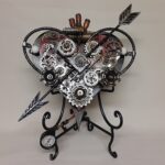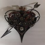 This is an aged Steampunk Arrow through the Heart sculpture made form various materials.