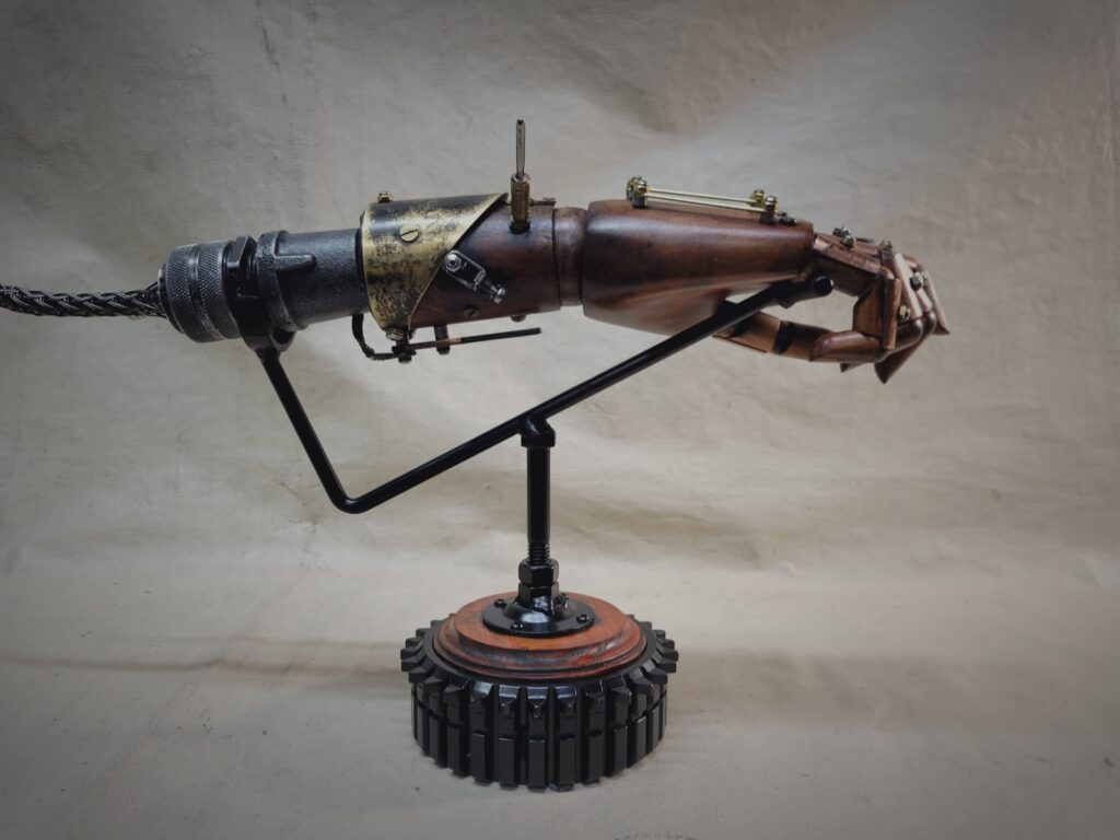 Steampunk Battle Damaged Robotic Wooden Android Hand Relic W/Table Top Display Right Hand Brass Collar