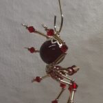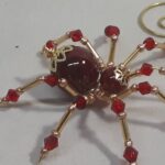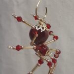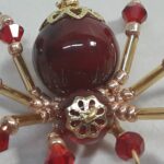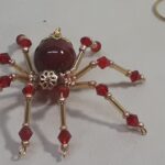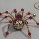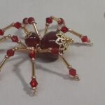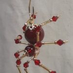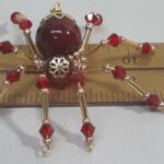 This is a handmade beaded crystalline spider. The abdominal area is made from a red plastic bead and the head from a smaller red faceted bead. The legs are made form 21 ga. brass wire which are covered with small Red Swarovski Glass and gold glass beads. Gold bead caps are also incorporated into the body. A gold decorative hook is attached to the back of the abdomen and can be used to hang the spider or be removed.