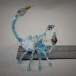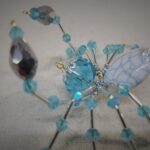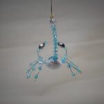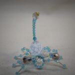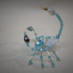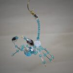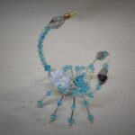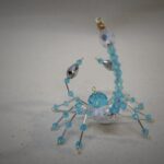 This is a handmade beaded crystalline scorpion. The abdominal area is made from a large white and gray bead with a smaller faceted blue bead for the head. The legs are made from flexible but sturdy 21 ga. wire which are covered with small silver and blue glass beads. The pincers are made from pewter faceted conical beads. Silver bead caps are also incorporated into the body. A gold decorative hook is attached to the back of the tail and can be used to hang the scorpion or be removed.
