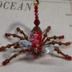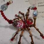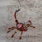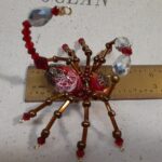 This is a handmade beaded crystal scorpion. The abdomen is made from a red decorative ceramic bead with white swirls in it and the head is a smaller pewter faceted plastic bead. The legs are made from flexible but sturdy 21 ga. brass wire which are covered with small Swarovski Glass beads. The pincers and stinger are made from pewter faceted beads. Brass bead caps are also incorporated into the body. A decorative gold hook is attached to the back of the tail and can be used to hang the scorpion or be removed.