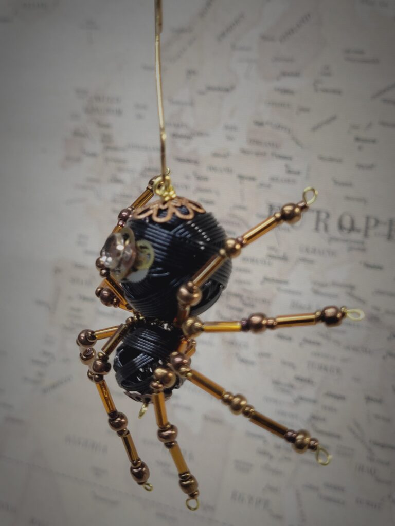 This is a handmade beaded metal pewter spider. The abdominal area is made from a large woven metal black colored wire bead. Small gears have been mounted to the side as well and may vary slightly from spider to spider. The head is a smaller woven metal wire black bead. The legs are made from flexible but sturdy 21 ga. wire which are covered with small Swarovski Crystal glass beads. Brass bead caps are also incorporated into the body. A 2″ decorative hook is attached to the back of the abdomen and can be used to hang the spider or be removed.