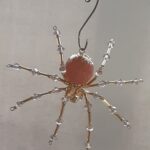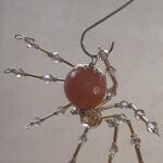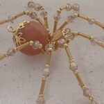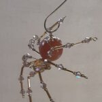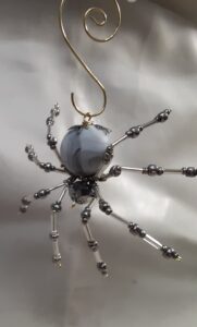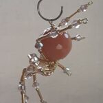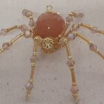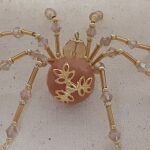 This is a handmade beaded spider. The abdominal area is made from an 18 mm faceted Aventurine Stone bead and the head is a smaller 10 mm amber crystal faceted bead. The legs are made from flexible but sturdy 21 ga. brass wire which are covered with small gold crystal beads and glass gold beads that can be carefully adjusted to almost any position. Gold bead caps are also incorporated into the body. A 1.75″ golden hook is attached to the back of the abdomen and can be used to hang the spider or be removed.
