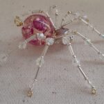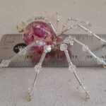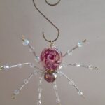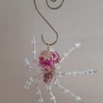 This is a handmade beaded crystalline spider. The abdominal area is made from a 20 mm pink floral acrylic bead and the head from a smaller pink faceted glass bead. The legs are made form 21 ga. wire which are covered with small clear Swarovski Glass and silver glass beads that can be carefully adjusted to almost any position. Silver bead caps are also incorporated into the body. A gold decorative hook is attached to the back of the abdomen and can be used to hang the spider or be removed.