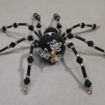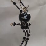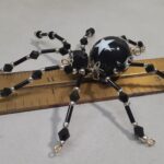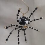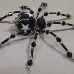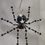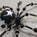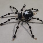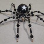 This is a handmade beaded black spider. The abdomen is made from a black plastic bead with white stars and the head is a black faceted plastic bead. The legs are made from flexible but sturdy 21 ga. wire which are covered with small Swarovski Glass beads with small black and white plastic beads. Silver bead caps are also incorporated into the body. A decorative gold hook is attached to the back of the abdomen and can be used to hang the spider or be removed.