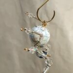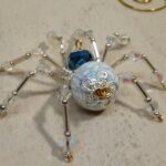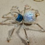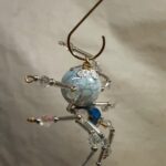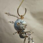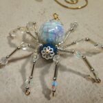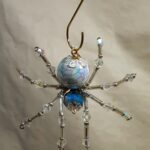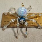 This is a handmade beaded spider. The abdominal area is made from a large blue veined ceramic bead and the head is a smaller plastic blue faceted bead. The legs are made from flexible but sturdy 21 ga. brass wire which are covered with small Swarovski glass beads and plastic beads. Silver bead caps are also incorporated into the body. A 1.75″ golden hook is attached to the back of the abdomen and can be used to hang the spider or be removed.